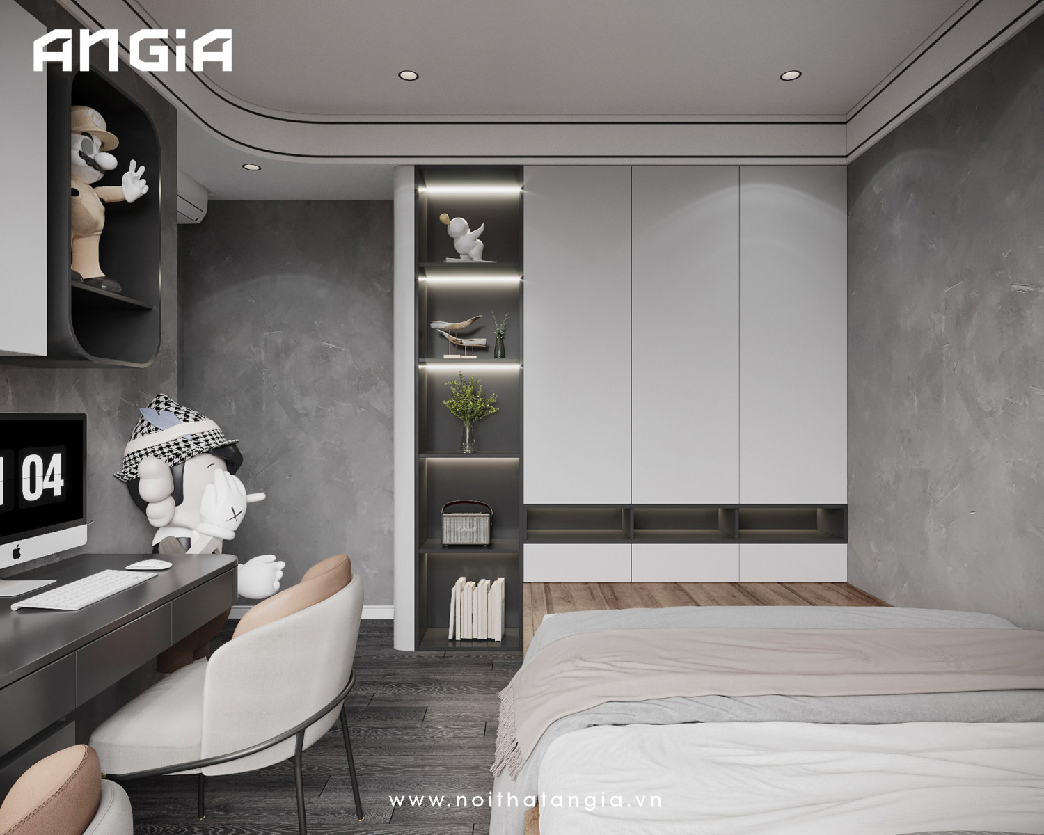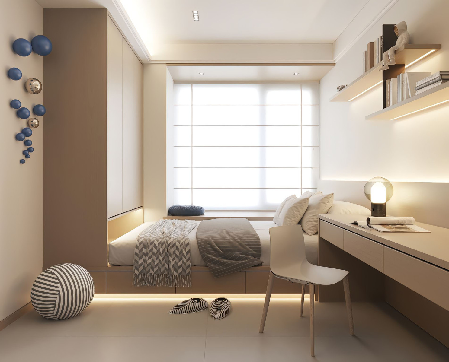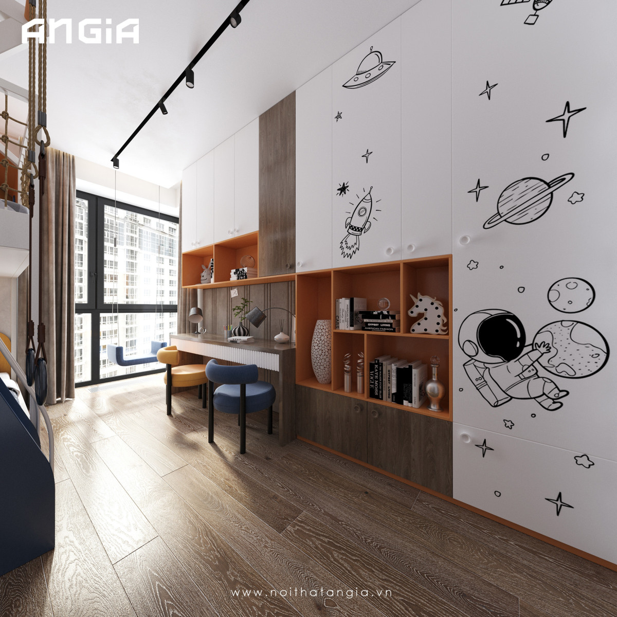 4. Tích hợp không gian học tập: Đặt một khu vực học tập tại phòng ngủ với bàn học và ghế ngồi thoải mái. Bạn có thể tích hợp các giải pháp lưu trữ thông minh để giúp trẻ dễ dàng truy cập vào sách vở và đồ dùng học tập.